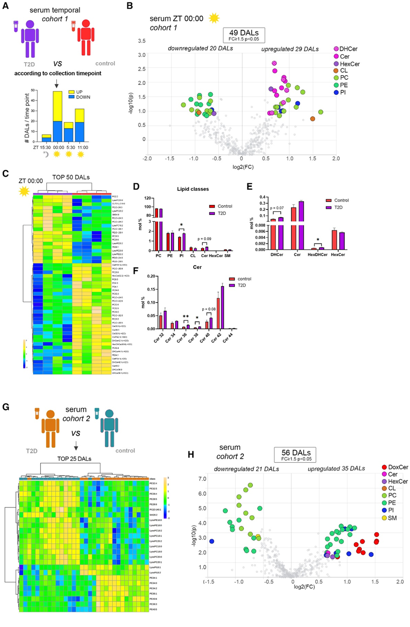 他们重点关注队列 1 参与者在清晨时间点 ZT0:00 的 T2D 血清中脂质稳态的变化,该变化在各组之间表现出最明显的变化。他们在一个较大的人类队列中的一个早晨时间点对 T2D 和 ND 个体的血清进行了脂质组学分析,采用相同的脂质测量方法(队列 2;每组 n = 16)。在队列 2 研究中,在隔夜禁食后于上午 8 点至 10 点之间采集血液样本,这大致与队列 1 中的 ZT0:00 相对应。因此,重新分析了从队列 2 个体获得的血清中的脂质组学数据,将来自队列 1 的新数据与独立队列 2 中进行的类似样本子集进行交叉比较,对脂质丰度和层次聚类进行了差异分析(图 2B-H)。