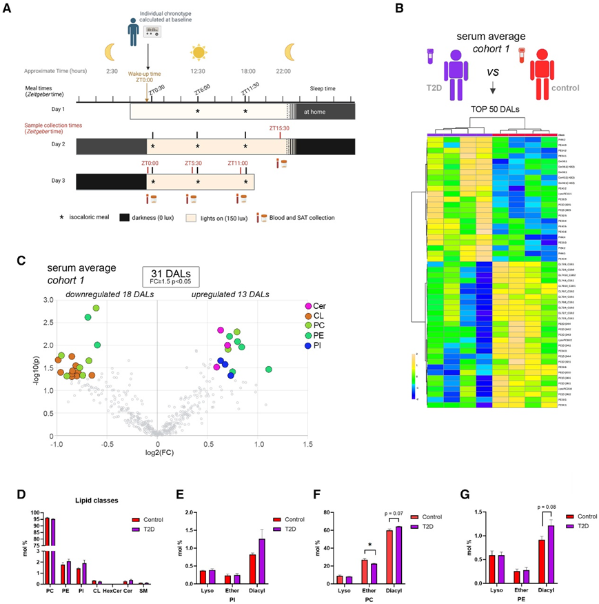 本项研究采用液相色谱串联质谱法来研究 2 型糖尿病 (T2D) 和非糖尿病 (ND) 人类志愿者皮下白色脂肪组织 (SAT) 和血清中脂质代谢的日常调节。ND 和 T2D 受试者的血清和 SAT 中约 8% 的约 440 种脂质代谢物表现出昼夜节律性。ND 和 T2D 个体之间的节律性脂质谱有所不同,在清晨观察到的变化最为显著,这一点通过在单个早晨时间点对 ND 和 T2D 受试者独立队列进行的脂质组学证实。引人注目的是,T2D 受试者的血清和 SAT 中节律性的代谢物表现出相位差异。本项研究揭示了 T2D 中人类脂质稳态的大量时间和组织特异性改变,为脂质生物标志物的时间发展提供了重要线索。