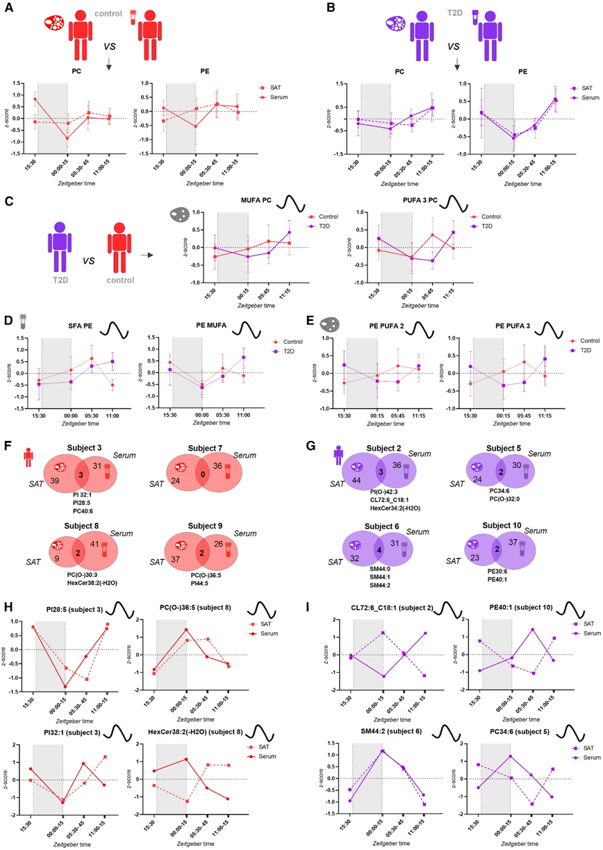 对每个组织和研究组分别进行的时间分析表明,PE 以及较小程度上的 PC 在多种条件下发生波动。对照供体的血清和 SAT 中 PC 和 PE 脂质的每日节律分布在不同时间点达到最高水平(图 5A)。相比之下,T2D 血清和 SAT 之间的 PC 和 PE 时间曲线大部分重叠(图5B)。根据脂质饱和度观察到对照组和 T2D 组之间的主要差异。事实上,MUFA 和 PUFA 3-PC 在 T2D 和对照 SAT 中具有显著的节律性;然而,它们的波动峰值在 T2D 和对照之间发生了强烈的偏移(图5C)。同样,PE 脂质的节律性也根据饱和度和供体组而变化。在血清中,饱和脂肪酰 (SFA) 和 MUFA-PE 在 T2D 和对照组中表现出可比较的时间分布(ZT11:00 除外),尽管 SFA-PE 仅在对照组中显示出显著的日节律,而 MUFA-PE 在对照组中显示出显著的日节律。 T2D 组(图5D)。相反,PUFA 2-3-PE 峰在对照样品和 T2D SAT 样品之间移动,最大富集分别在 ZT05:45 和 ZT11:15 与 ZT15:30 之间(图5E)。