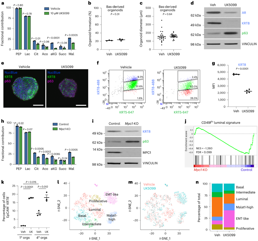 (a) 铺板后 7 天对载体和 10 μM UK5099 处理的基底衍生类器官进行[U- 13C] 葡萄糖示踪分析。(b-c) 载体和10μM UK5099处理的基底衍生类器官形成百分比和类器官直径。(d)免疫印迹分析。 (e)免疫荧光分析。(f)流式细胞分析。(g) KRT8 平均荧光强度 (MFI) 的量化。(h) 对照和Mpc1 -KO 基底衍生类器官的[U- 13C] 葡萄糖示踪分析。(i) 免疫印迹分析。(j) GSEA分析。 (k) 流式细胞分析的定量。(l-m) t-SNE可视化。(n) 每个聚类中载体和 10 μM UK5099 处理的细胞的百分比进行定量。
