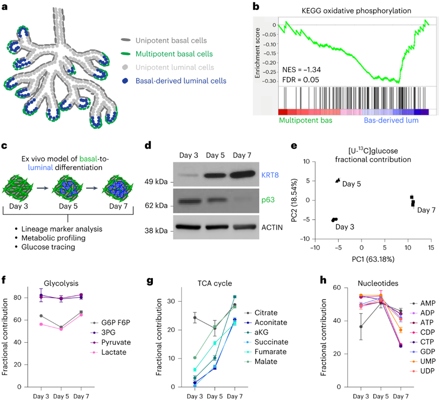 (a) P10-P12小鼠前列腺基底至管腔分化的体内模型示意图。(b) GSEA显示基底源性管腔细胞中的KEGG氧化磷酸化相对于体内多能基底细胞的富集。 (c) 在接种类器官培养物后3、5和7天对原代基底来源的小鼠类器官进行谱系标记分析、代谢组学分析和葡萄糖追踪的示意图。 (d) 免疫印迹分析。 (e)PCA分析。 (f-h)基底源性类器官中糖酵解、TCA和核苷酸中间体的[U-13C]标记比例。