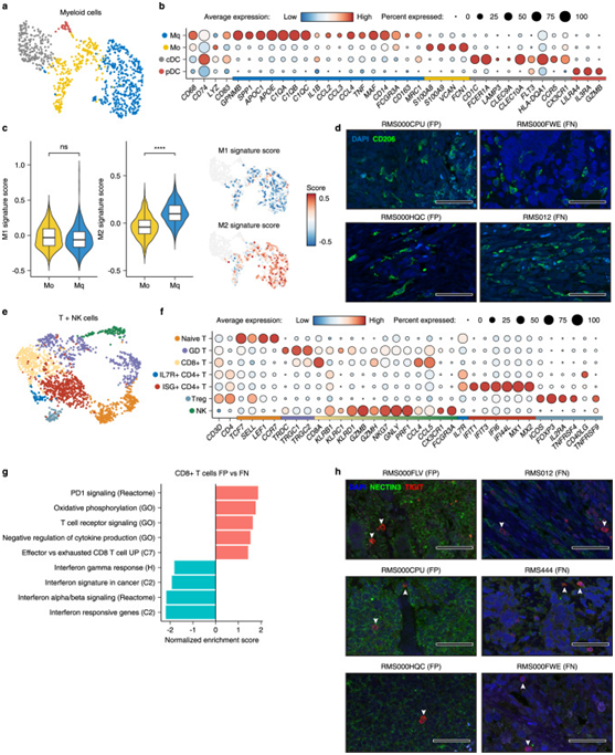 a.骨髓细胞的UMAP投影。b.描绘所选细胞类型特异性基因(Mq=分化的巨噬细胞,M0=未分化的巨噬细胞,cDC=常规树突细胞和pDC=浆细胞样树突细胞)的平均表达图。c. Violin/Box和UMAP组合图显示了M1(左图)和M2(右图)特征分数在未分化(M0)和分化(Mq)巨噬细胞中的分布。d.代表性免疫荧光(IF)显微镜图像。e.T细胞和NK细胞的UMAP投影。f.描绘所选细胞类型特异性基因的平均表达的点图。g.通过比较RMS亚型之间的CD8+T细胞的基因集富集分析(GSEA)确定的所选基因集的归一化富集分数(NES)。h.代表性IF显微镜图像。