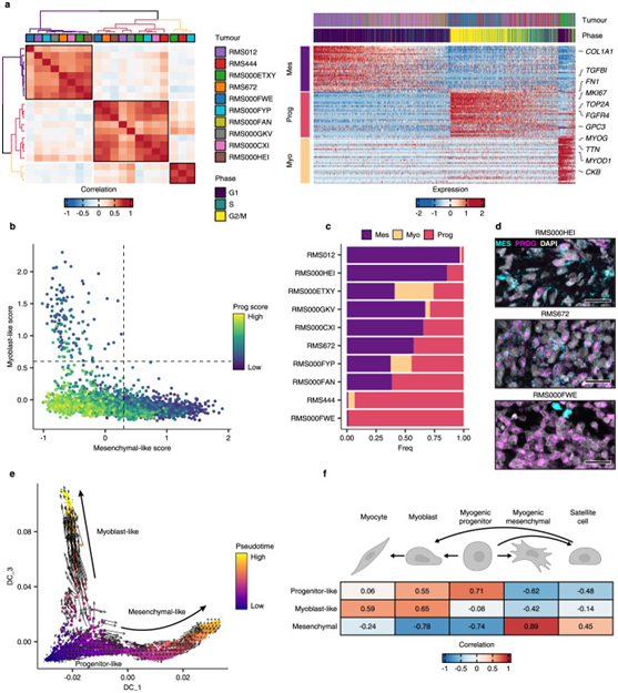a左图:热图显示FN样本中所有NMF定义的转录程序之间的成对Pearson相关性。右图:每个元程序中前30个基因在所有FN细胞中的比例表达。b描述间充质样(x轴)、成肌细胞样(y轴)和祖细胞样(点色)元程序评分的散点图。c每个FN肿瘤在每个离散状态下的细胞比例。d代表性RNA荧光原位杂交(RNA-FISH)图像,描绘了FN组织样品中间充质样(MES=TGFBI)和祖细胞样(PROG=FGFR4)细胞状态标记基因的表达。e FN RMS单细胞的扩散图投影,用假时间值着色,覆盖RNA速度矢量场。f描绘细胞状态评分之间皮尔逊相关性的热图,以及每种正常肌源性细胞类型的逻辑回归定义的相似性评分(logits)。