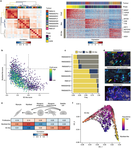 a左图:热图显示FP样本中所有NMF定义的转录程序之间的成对Pearson相关性。右图:每个元程序中前30个基因在所有FP细胞中的比例表达。b描述每个单元元程序得分的散点图。c每个FP肿瘤在每个离散状态下的细胞比例。d代表性RNA荧光原位杂交(RNA-FISH)图像。e描绘FP细胞状态评分之间的Pearson相关性的热图,以及每种正常肌源性细胞类型的逻辑回归定义的相似性评分(logits)。f FP RMS单细胞的扩散图投影。