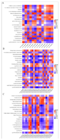 为了筛选相关的DEGs和DAMs,我们进一步通过Pearson相关系数对DEGs和DAMs进行分析。图5表明为前20位的DEGs和DAMs的相关性,说明DEGs和DAMs的相关性较高。转录组和代谢组的综合分析显示,MPs、DEHP和MPs-DEHP毒理学效应的代谢应答可能分别涉及1、7和4条功能通路。在这些途径中,MPs组中具有代表性的途径是中的甘油磷脂代谢。同样,在DEHPM组中,最明显的途径是嘌呤代谢、赖氨酸降解、血小板活化、氨基糖和核苷酸糖代谢以及神经活性配体-受体相互作用。此外,MPs-DEHP组最丰富的途径是嘌呤代谢和视黄醇代谢。