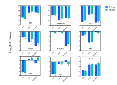 从RNA-Seq中随机选择的9个基因,利用RT-qPCR验证RNA-Seq结果的可靠性。上述选择的基因参与花生四烯酸代谢(CYP2L1)、甘油脂代谢(PNLIPRP1),嘌呤代谢(PDE3B),PPAR信号通路(DBI、PCK2),PI3K-Akt信号通路(HSP90AA1、PCK2),NOD样受体信号通路(HSP90AA1)和AMPK信号通路(EF2、PCK2)。三个治疗组的RT-qPCR结果和靶基因相对表达水平的转录组分析比较如图4所示。在三个治疗组中,这些基因在RT-qPCR中的表达趋势与转录组分析结果基本一致,说明RNA-Seq结果是可靠的。