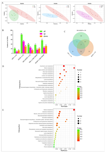 为了深入研究MPs、DEHP和MPs-DEHP对南美白对虾的潜在影响,作者对南美白对虾的肝胰腺组织进行转录组学分析。PLS-DA显示,每组有3个生物重复聚类(图2A),表明了组间的显著差异。通过在四组(CK、MPs、DEHP和MPs-DEHP)中进行5种对比(CK/MPs、CK/DEHPM、CK/MPs-DEHP、MPs/MPs-DEHP、DEHP/MPs-DEHP),与MPs-DEPH相比,DEHP诱导大量的DEGs(差异表达基因),MPs组只有少量DEGs显著改变。