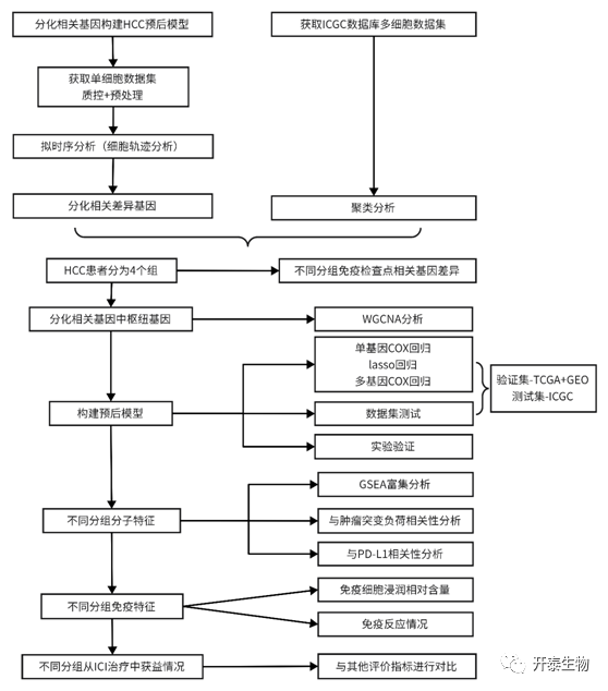 单细胞RNA测序(single cell RNA sequencing,scRNA-seq)可以深度揭示细胞的复杂功能和机制,并且通过分析细胞分化轨迹来获得细胞间的差异。本文基于对scRNA-seq中细胞分化轨迹的分析,确定HCC不同组织亚型并做细致描述其特征。同时,利用加权基因共表达网络分析(Weighted Gene Co-Expression Network Analysis ,WGCNA)从癌症数据库(TCGA)的多细胞测序数据,寻找与细胞分化相关的“枢纽”基因,构建分化相关基因预后指数和列线图,预测 HCC患者的免疫治疗后的反应。本文通过结合已有单细胞和多细胞测序,找到能够预测HCC患者对ICI治疗反应的生物标志,表明分化相关基因预后评分(differentiation-related gene prognostic index,DRGPI)可能是一种有前途的预后生物标志物。