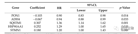 计算GEO和TCGA数据集中交集基因并且筛选其中的分化相关基因,共获得553个与HCC分化相关的差异表达基因。同时,WGCNA分析产生5个模块,其中3个模块中158个差异表达的HDRG与HCC的病理分级显着相关。生存分析证实25个分化相关枢纽基因的表达与HCC患者的预后密切相。采用单变量Cox回归分析、Lasso回归分析、多变量 Cox 回归分析最终构建了包含5个预测基因(PON1、ADH4、SQSTM1、HSP90AA1 和 STMN1)的预后指数(表 1)。