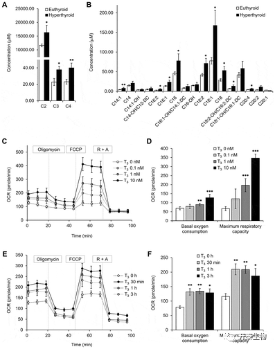 接着作者想探究T3对棕色脂肪线粒体自身存在何种影响(图4),发现甲亢小鼠BAT中,长链和短链酰基肉碱的含量以及Cpt1b的表达显著增加(图4 A、B)。检测T3作用24h后检测OCR发现(图4 C),原代棕色脂肪细胞基础耗氧率和最高耗氧率均显著增加,并且短时间内(30min),T3就能增强原代棕色脂肪细胞的线粒体呼吸(图4 C-F)。
