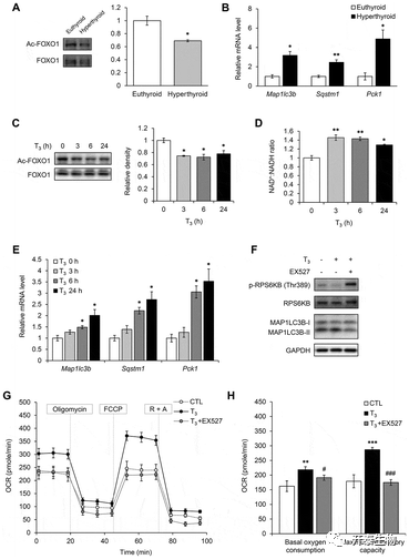 文章最后发现甲亢小鼠BAT中,FOXO1乙酰化水平下降,其靶基因表达增加,表明T3处理激活脱乙酰基酶SIRT1,并最终证实SIRT1活性和自噬诱导对线粒体功能很重要。