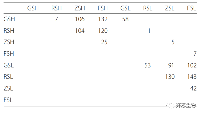 各组之间属级细菌相对丰度的差异与PCoA结果一致(表1)。在GSL和RSL之间发现了53个不同的细菌属,而在GSH和RSH之间只发现了7个不同的菌属,这表明H可能会减少GS和RS之间的群落差异。GS在H和L之间有58个分化的细菌属,大于RS、ZS和FS中分别发现的1、5和7个。进一步表明,GS的细菌群落组成与CS的严重程度有关。