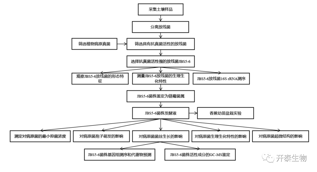 本研究从香蕉园土壤中分离鉴定出对Foc TR4具有较强抗真菌活性的链霉菌JBS5-6,其发酵液可以抑制Foc TR4的菌丝生长和孢子萌发。