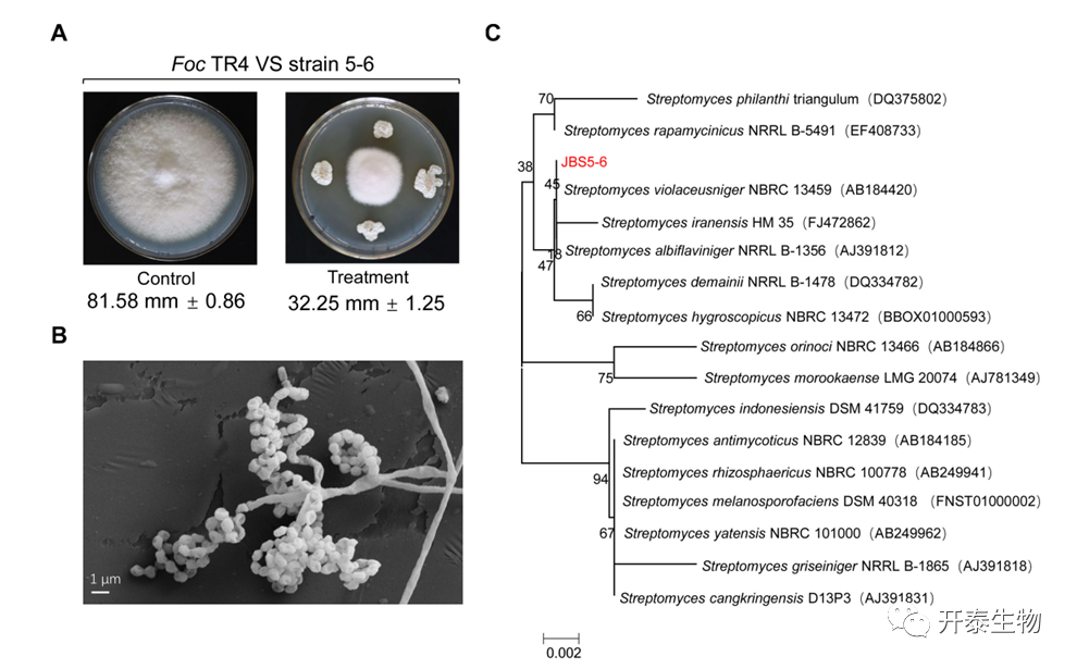 从超过10年无香蕉枯萎病症状的香蕉园中分离到88株放线菌,针对Foc TR4进行筛选。17个放线菌在初步实验中显示了抗真菌活性,其中,JBS5-6的菌株对FocTR4表现出很强的抗真菌活性,抑制率为60.46%(图1A)。