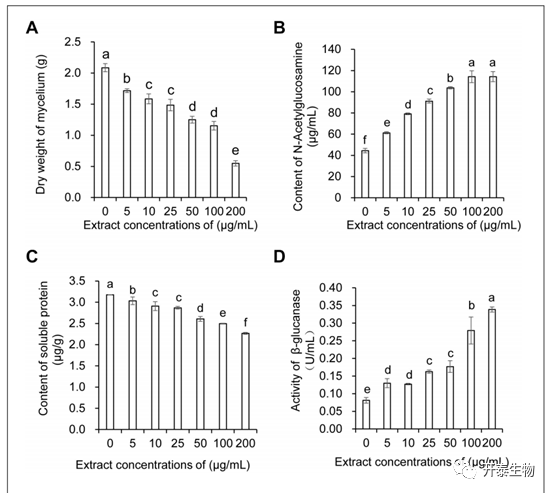 图3. JBS5-6菌株对Foc TR4的(A)菌丝体干重、(B)N-乙酰葡糖胺含量、(C)可溶性蛋白质含量(D)β-葡聚糖酶活性的影响