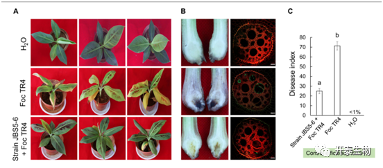 (A)接种JBS5-6、Foc TR4菌株35天后叶片的黄化形态 (B)35天后Foc-TR4在香蕉幼苗茎和根中的感染症状(C)35天后香蕉幼苗的病情指数的定量分析