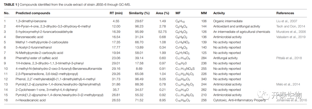 表1. 通过GC-MS从菌株JBS5-6的发酵液中鉴定出的化合物