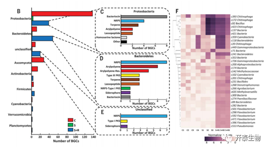 (A)内生根微生物中检测到的不同类别的BGCs的序列相似性网络 (B) 生长在C、S和S+R土壤中的植物内生根微生物群中的不同细菌门类( C到E)分配给Proteobacteria、Bacteroidetes 、未分类菌群的BGCs的数量和类型 (F)相对丰度的聚类热图