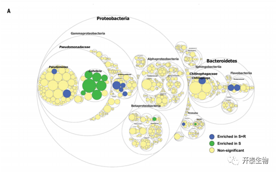 (B)功能差异基于元基因组序列数据并分配给分类群 最小的圆表示 COG 类别组;圆圈大小代表不同丰度的分类群和功能的平均相对丰度;在S和S+R的比较中,显著富集的细菌类群或功能(FDR<0.1)用绿色表示S,用蓝色表示S+R;不显著的类群和功能用黄色表示