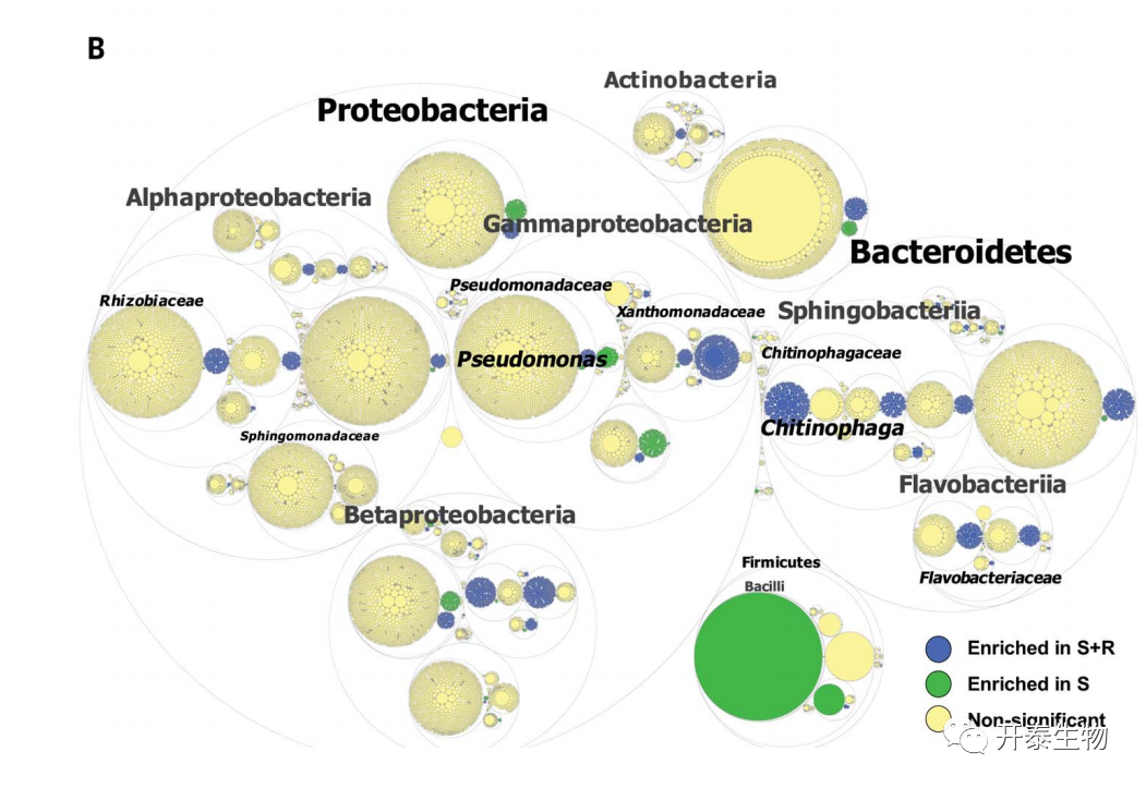 元基因组16S rRNA测序结果表明,Proteobacteria 、Bacteroidetes在内生根微生物群落中占主导地位,共有10个OTU:Pseudomonadaceae(2个)、Xanthomonadaceae(4个)、Chitinophagaceae(1个)、Flavobacteriaceae(2个)Veillonellaceae(1个),与S土壤相比,这些单位在S+R土壤中都变得丰富(图1A)。