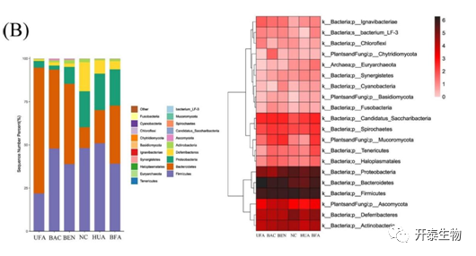 图2.BFA处理前后高尿酸血症小鼠门水平上肠道微生物组成柱状图及丰度聚类图