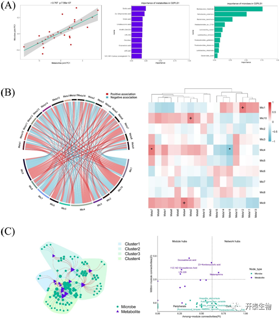 A.OSPLS分析影响前十位的代谢物及肠道微生物;B.代谢物与肠道微生物关联系数的热图和弦图;C.代谢物与肠道微生物相关性的网络分析图和Zi-Pi图