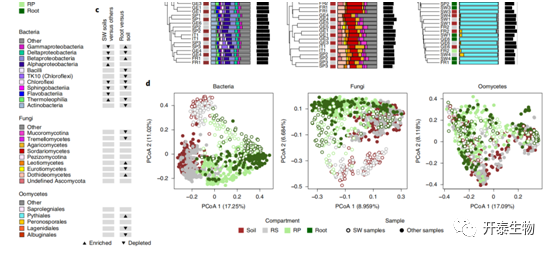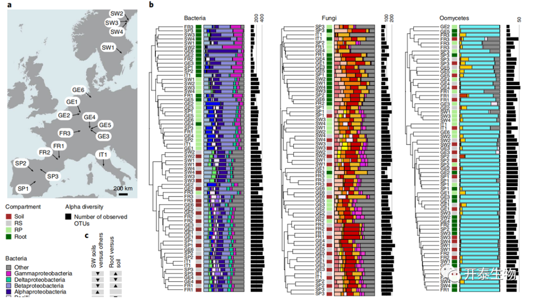 对样品的α多样性指数、微生物群落结构分析表明,从土壤到根内层,细菌的多样性比丝状真核生物的多样性减少更大(图1b和扩展数据图2 a,b)。根内层和根际中的细菌群落按分区、根际和土壤中的位置聚类,而真菌和卵菌类没有明显的分类(图1b)。瑞典土壤和其他欧洲土壤的细菌群落存在明显差异(图1c,d),在根系样品中差异大大减少,表明植物内层细菌群落组成趋同(图1 d)。此外,根样品中细菌OTU的百分比高于土壤样品(扩展数据图3b,c)。结果表明,根环境推动了欧洲各地细菌群落组成的趋同。
