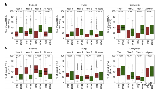 (b)土壤和根系样品中共有的高丰度OTU的百分比(c)土壤和根系样品中共有的低丰度OTU的百分比