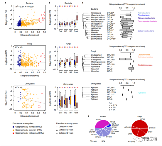 (a) 细菌、真菌和卵菌的OTU流行率与植物根中OTU RA的相关性 (b)细菌 ,真菌和卵菌在四每个区中检测到的地理限制的,常见的和广泛的OTU的箱形图 (c) 细菌、真菌和霉菌的系统发育树(d)在拟南芥根中检测到的广泛分布的细菌和真菌 OTU的比例