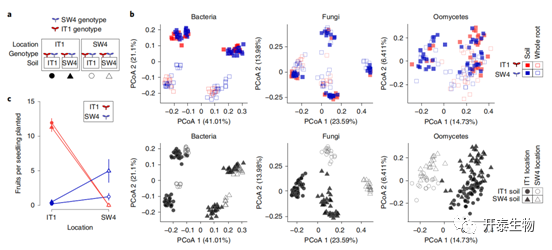 (a)互换移植实验的示意图(b)通过PCoA测定131个样品中细菌、真菌和卵菌的群落结构(c)意大利基因型(红色)和瑞典基因型(蓝色)的总体适应性