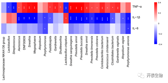 为了解失眠组的肠道微生物群与炎症因子之间的潜在相关性,作者进行了Spearman 相关性分析(图3)。发现失眠组的大多数属种与TNF-α呈正相关性,而乳酸杆菌(Lactobacillus)和链球菌(Streptococcus)与TNF-α呈负相关,值得注意的是这两种菌在失眠组中显著增加(图4)。IL-1β与大多数属种呈负相关,只有乳酸杆菌与其呈正相关。