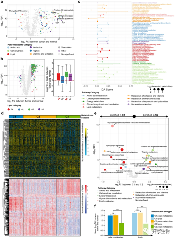 作者使用330个TNBC样本和149个配对的正常乳腺组织样本集进行TNBC代谢组学的分析。首先,从整体上,作者分析了肿瘤和正常样品之间代谢物和脂类的表达差异。与正常组织相比,肿瘤中显著富集了与氧化反应和糖基转移相关的代谢产物(如氧化谷胱甘肽和尿苷二磷酸葡萄糖)(图1a)。另外,磷脂酰肌醇、脂肪酸和神经酰胺等脂类也在TNBC肿瘤组织中富集(图1b)。进一步,作者还分析了肿瘤组织中失调的代谢途径(图1c)。随后,作者将TNBC代谢组学数据通过相似网络融合(SNF)方法分为三个亚型(图1d)。其中,代谢组C1亚型特征性富集鞘脂和脂肪酸,而代谢组C2亚型的特征为碳水化合物代谢和氧化反应上调(图1e)。而代谢组C3亚型在正常组织和肿瘤组织中仅表现出轻微的代谢差异(图1f)。总体来说,TNBC的代谢组学聚类分析揭示了代谢异质性,并为进一步的靶点探索提供了见解。