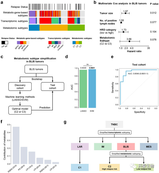进一步,作者探讨了代谢组分型、转录组分型和基于代谢途径分型(MPS)之间的关联。在转录组亚型方面,LAR亚型几乎与代谢组C1亚型重叠;BLIS、免疫调节(IM)和间充质样(MES)亚型主要分为代谢组C2和C3亚型(图2a)。并且,代谢组亚型可以作为于BLIS患者的独立预后因素(图2b)。接下来,作者通过机器学习方法为BLIS肿瘤建立一个简化的代谢组分型方法,并且该方法在测试队列中都具有良好的预测效果(图2c,d),作者通过受试者体操作特性(ROC)曲线以及所包含的六种代谢产物的贡献进一步证明了LASSO模型的预测效力(图2e,f)。总之,代谢组学分析完善了之前的TNBC转录组分型(图2g)。