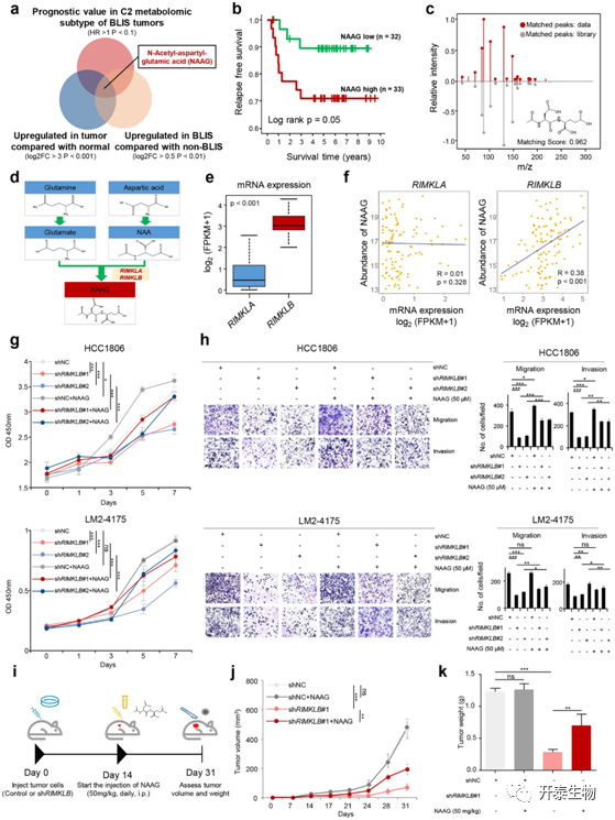 作者进一步探究了BLIS肿瘤的重要促肿瘤代谢产物。在分析了BLIS肿瘤中特异性上调和预测不良预后的代谢物后,作者确定N-乙酰天冬氨酰谷氨酸(NAAG)为潜在候选(图4a,b,c)。据报道,RIMKLA和RIMKLB这两种酶负责NAAG的产生(图4d),进一步RIMKLB在转录组水平上显著高于RIMKLA,并且与NAAG的丰度呈正相关,因此,作者推测RIMKLB是决定TNBC中NAAG水平的关键酶(图4e,f)。在HCC1806和LM2-4175细胞系中用shRNA敲除RIMKLB后,NAAG丰度显著降低,并伴随着生长速率、迁移和入侵能力的降低。在培养基中加入NAAG后,RIMKLB敲除导致的肿瘤抑制作用得到部分缓解(图4g,h)。随后,作者通过小鼠荷瘤实验进一步验证了RIMKLB敲除显著抑制了肿瘤生长,并通过补充NAAG部分缓解了抑制肿瘤生长的作用(图4i–k)。这些数据表明,NAAG是BLIS肿瘤中重要的促肿瘤代谢产物,靶向NAAG的生物合成可能是一种可行的治疗策略。