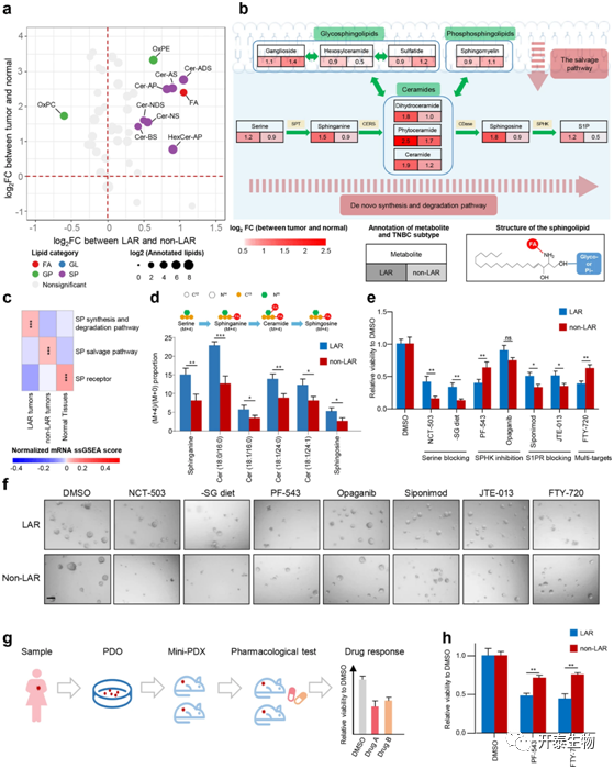 转录组LAR亚型与代谢组C1亚型几乎重叠(图2a),其特征是鞘脂相关代谢产物的富集(图1e)。因此,作者分析了鞘脂代谢途径的详细中间体来确定LAR肿瘤的关键代谢产物。与正常组织和非LAR肿瘤相比,LAR肿瘤的特征是神经酰胺的富集(图3a)。对代谢产物的和代谢相关基因的进一步分析表明,神经酰胺途径的从头合成和降解在LAR肿瘤中更为活跃,而糖基和磷酸基的转移在LAR肿瘤和非LAR肿瘤之间没有显著变化(图3b,c)。这些结果表明神经酰胺途径的从头合成和降解在LAR肿瘤中的关键作用。此外,作者还利用稳定同位素示踪实验来进一步说明LAR亚型中活跃的神经酰胺途径(图3d)。为了研究LAR肿瘤的潜在治疗策略,作者系统地阻断了细胞系和患者衍生的类器官(PDO)模型中神经酰胺途径从头合成和降解的每一步。结果表明,PF-543(SPHK1的抑制剂)和FTY-720(S1P拮抗剂)对LAR肿瘤显示出了更有效的抑制效果(图3e,f)。此外,作者使用患者来源异种移植(PDX)模型同样验证了PF-543和FTY-720对LAR肿瘤生长的抑制作用(图3g,h)。总之,结果表明S1P是神经酰胺途径的重要中间体,在LAR肿瘤中起着关键作用。PF-543和FTY-720可能是LAR亚型肿瘤的特异性治疗方法。