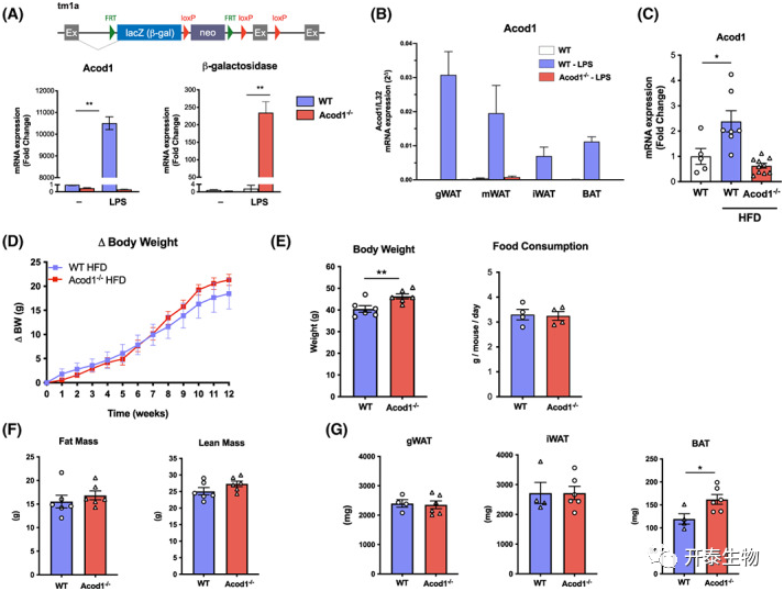 对WT和Acod1-/-小鼠饲喂高脂饮食12周,发现它们的体重呈等速增长,摄食量也无显著差异(图1D,E)。尽管Acod1-/-小鼠终末体重略高于WT组,但这是因为Acod1-/-小鼠的基础体重更大。此外,WT和Acod1-/-小鼠的脂肪质量和瘦体重没有显著差异(图1F),gWAT和iWAT质量也无显著差异,但Acod1-/-小鼠的棕色脂肪组织(BAT)质量显著高于WT组(图1G)。
