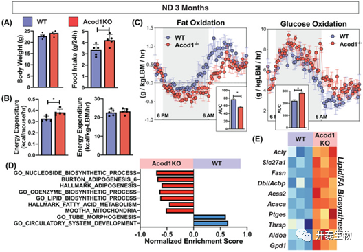基于以上发现,作者使用实验动物检测系统(CLAMS)进一步探究了Acod1-/-小鼠随年龄增加而自发性肥胖的机制。CLAMS期间,Acod1-/-小鼠的食物摄入量增加,每只小鼠的静息能量消耗增加,当瘦体重正常化时,这些都消失了(图9A、B)。Acod1-/-和WT小鼠的活动和呼吸交换率无差异。底物利用评估表明,与WT组相比,Acod1-/-小鼠的脂肪氧化减少,葡萄糖氧化增加(图8 C)。eWAT的RNA-Seq鉴定到1279个DEGs。Acod1-/-小鼠中,和脂肪合成、脂质生物合成、脂肪酸合成等通路相关的基因(如Acly, Fasn, Slc27a1, Acbp)显著增加(图9D、E)。