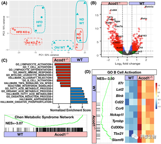 进一步对eWAT进行RNA-Seq。PCA分析显示,老年Acod1-/-小鼠和高脂饮食组(HFD)组集群,老年Acod1-/-小鼠中炎症基因显著富集到巨噬细胞活化、淋巴细胞活化。和DIO小鼠类似,老年Acod1-/-小鼠中与B细胞活化有关的基因表达增加,这表明Acod1-/-小鼠随着年龄增长而肥胖,导致了不健康的WAT扩张和骨髓炎症(图8A-D)。