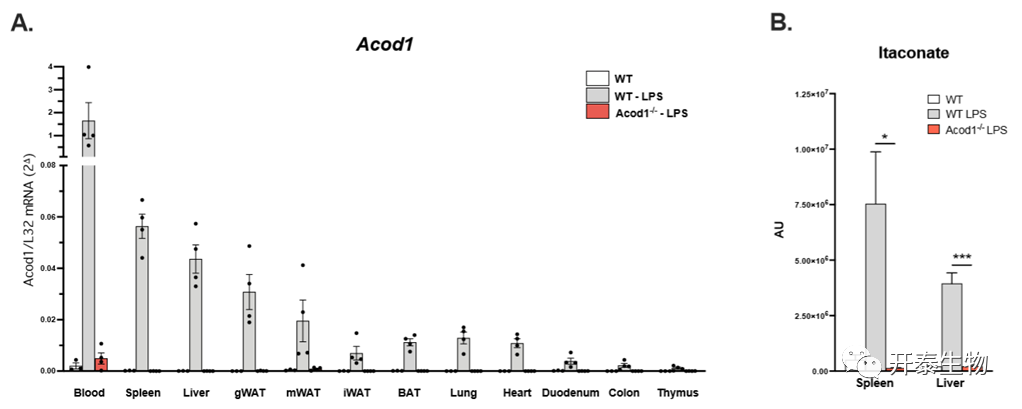 通过基因敲除小鼠计划(KOMP)得到Acod1-/-小鼠模型,且在脂多糖(LPS)诱导后,骨髓源性巨噬细胞中的Acod1表达受到抑制,表明基因敲除模型构建成功(图1A)。LPS诱导的全身性炎症导致WT小鼠性腺白色脂肪组织(gWAT)、肠系膜白色脂肪组织 (mWAT) 和腹股沟白色脂肪组织 (iWAT) 中的Acod1表达显著增加(图1B);同样,DIO野生型小鼠(WT)的gWAT中Acod1表达也显著增加(图1C)。此外,经LPS诱导的全身性炎症导致Acod1在全身多处组织中表达增加,而在肝脏和脾脏中,LPS诱导的衣康酸产生量最多(图2A, B)。