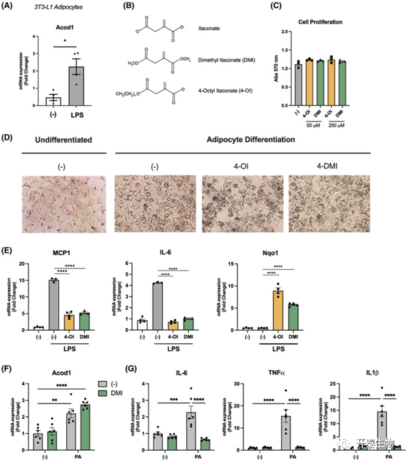 为了进一步评估衣康酸在调节脂肪细胞功能中的作用,作者用LPS刺激3T3-L1脂肪细胞,发现Acod1表达显著增加(图5A)。为了评估衣康酸衍生物4-OI和DMI是否影响脂肪细胞的分化,用或不用衣康酸类似物处理3T3-L1细胞,未观察到细胞增殖、分化或形态学差异(图5B-D)。为了进一步评估衣康酸衍生物对炎症的作用,在存在或不存在4-OI或DMI的情况下,用LPS处理3T3-L1细胞,4-OI和DMI均显著抑制LPS诱导的MCP1和IL-6表达,同时Nqo1基因(一个Nrf2依赖基因)表达增加(图5 E)。棕榈酸(PA)是血清中最丰富的游离脂肪酸之一,它促进组织中的炎症和胰岛素抵抗。与LPS刺激相似,用PA处理3T3-L1细胞导致Acod1 mRNA表达增加(图5F)。此外,作者还评估了DMI的影响,发现DMI(125 μM)预处理显著抑制了PA诱导的炎症基因表达(图5G)。