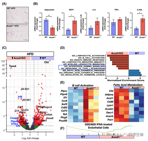 组织学检测表明,饲喂高脂饮食不影响附睾脂肪组织(eWAT)的形态和结构(图4A)。Acod1敲除上调MCP1和IL-1RA表达,但TNFα 和 IL-6无显著差异;此外,Adiponectin mRNA表达显著下降(图4B)。接下来对高脂饮食诱导的WT和Acod1-/-小鼠eWAT进行了RNA-seq,鉴定了1033个DEGs。基因集富集分析(GSEA)显示Acod1-/-小鼠的炎症基因显著富集到B细胞活化、淋巴细胞活化、干扰素应答和骨髓应答等(图4C-F)。