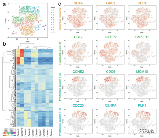 从健康供体的骨髓分离的第1代MSCs,并且细胞质量较好。MSCs对CD29、CD44和CD105呈阳性,而对CD14、CD34和CD45呈阴性,共捕获6998个细胞并将其分为10个簇(图 1a)。系统聚类分析显示这10个聚类之间关系密切(图1)。以CD14和CD163表达为特征的簇9和10具有不同的RNA谱和相对独立的位置,鉴定为来自骨髓的单核细胞/巨噬细胞,(图1a-b)。第1和第3组标记基因较少的簇,以及没有标记基因的簇 7 和 8,认为是过渡亚群。此外,显示更高水平的干性标志物(包括 SOX4、GAS1 和 DPP4)的簇 2预测为干性亚群,而表现出细胞因子和成骨/脂肪形成因子表达的簇 4 确定为功能亚群 (图1c)。簇5和6都表现出增殖和细胞周期相关基因的表达,但分为两个簇,归类为增殖亚群1和2(图1c)。