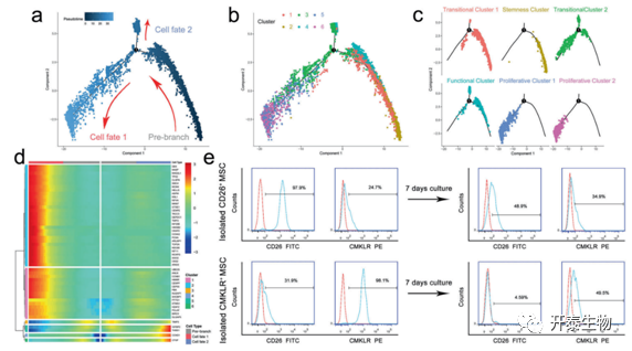 选择簇1-6来构建一个轨迹分支,该分支包含两个末端,分别对应于两个不同的细胞命运(图3a)。如图3b和c所示,过渡亚群1(簇1)和干性亚群(簇2)位于轨迹的根部。此外,增殖亚群均位于细胞命运1。细胞命运2由部分过渡亚群2(簇3)和功能亚群(簇4)组成。细胞增殖相关基因,如MKI67、MCM4和PCNA在细胞命运1中高表达,IGFBP2、CTGF和TIMP3的水平在细胞命运2中上调,但在细胞命运1中下调(图3d)。作者确定了干性亚群和功能性亚群之间的分化关系,分别特征表型CD26+和CMKLR1+来标记。培养7天后,分离的CD26+MSCs的CD26+比率下降,CMKLR1+比率上升。此外,CD26+比率在分离的CMKLR1+ MSCs中较低,并且在培养7天后进一步降低(图3e)。