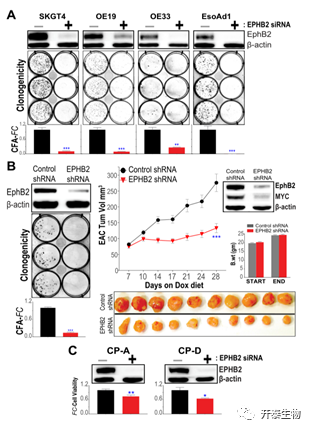 为了明确EphB2相关的生长依赖是否特定于恶性阶段,或者它们在先前的BE病变中是否明显,作者在BE化生(CP-A)和BE异型增生(CP-D)细胞中进行了EphB2 siRNA敲除。发现结果与先前观察类似,EphB2的敲除显著降低了BE-化生和-异型增生细胞的存活率(尽管程度较小)(图4C)。
