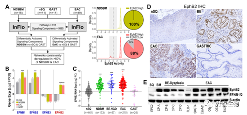 首先,作者使用InFlo系统生物学框架,根据来自预处理EAC/BE和非恶性(正常SQ和胃)活检组织中得到的RNA-seq数据,确定了BE-EAC发展中最常发生变化的通路网络。发现EphB2酪氨酸激酶信号在100%的BE和88%的EAC中过度激活(图1A),与正常SQ和胃组织相比,BE/EAC病变中选择性地诱导EphB2受体,同时EphB配体(EFNB1和EFNB2)略有增加(图1B)。