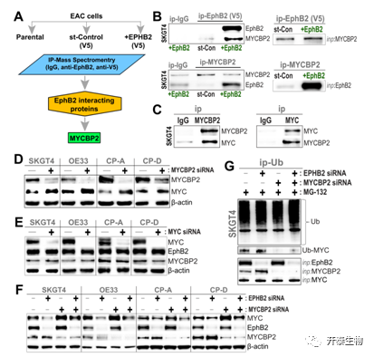 为了进一步探讨EphB2对MYC蛋白调控的机制,作者在一个具有代表性的EAC系(SKGT4)中,用原始EphB2抗体或对照IgG抗体以及EphB2稳定重组和不稳定重组进行了IP。通过质谱分析确定MYC结合蛋白2(MYCBP2)是内源性EphB2结合蛋白的结合伙伴(图3A),并用正反向IP-WB分析验证了这一点(图3B)。