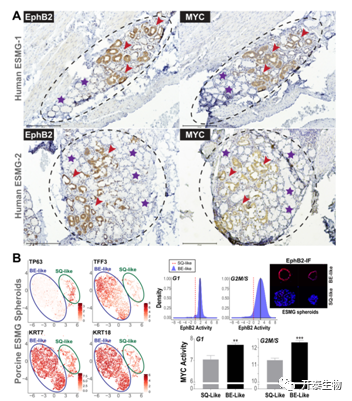 鉴于上述观察,接下来作者评估了EphB2和MYC在食道粘膜下腺(ESMGs)中的作用,ESMGs是一组参与食管损伤修复的前体细胞。因此,他们首先评估了ESMGs中EphB2的状态(这些ESMGs是从EAC患者接受化疗前手术切除的食管组织中获得的),在与EAC相关的ESMG中观察到了EphB2和MYC选择性的稳健模式(图6A)。接下来他们将自手术切除的单纯非EAC食道组织作为额外的对照,结果显示EphB2和MYC缺失。除此之外,他们使用源自猪食管的ESMGs的配套球体培养模型,进行单细胞RNA-seq和Inflo分析来评估EphB2-MYC的活性,发现BE样球体的EphB2和MYC活性显著高于SQ样ESMG球体,与细胞周期时相无关(图6B)。这些发现进一步表明,在前体细胞中诱导EphB2-MYC活性可能是BE发育的关键步骤。