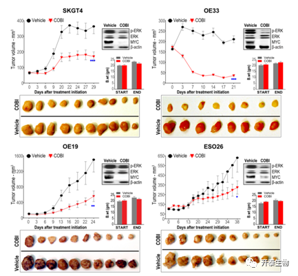 上述研究结果表明EphB2-MYC轴是EACS潜在的脆弱治疗靶点,然而,尚无临床批准的针对EphB2或c-MYC的抑制剂。有效的临床批准的MEK1抑制剂(Meki) 考比替尼在EAC细胞系中显示出显著的细胞毒性,因此作者在多种肿瘤异种移植模型中评估了考比替尼的抗肿瘤效果,发现其可导致体内EAC肿瘤生长的强烈抑制和/或消退,而且肿瘤中MYC蛋白显著减少(图7)。这些发现表明,对Meki的反应阈值可能取决于ERK、MYC和/或其他下游效应器的相对/联合水平,靶向MYC相关的上游信号轴可能是一种有益的EAC新治疗策略。