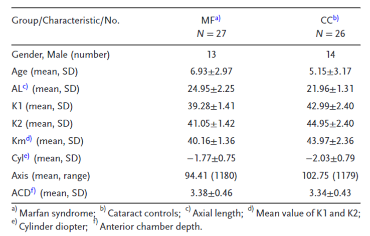 在发现阶段,研究者团队通过基于 LC-MS/MS 的数据独立采集 (DIA)和无标记定量分析了来自 53 名儿童的 53 个 AH 样本[27个 MFS 和 26 个白内障对照 (CC)]和 10 个晶状体囊组织样本(图1)。病例和对照的性别、年龄、AL、K1、K2、Km、Cyl、轴和前房深度(ACD)总结于表 1中。首先,他们进行差异丰度分析并比较每组中两个配对样本之间的差异表达蛋白(DEP)。功能富集分析用于揭示晶状体异位的生物样本特征,并进一步探索 MF 综合征的潜在生物学途径。