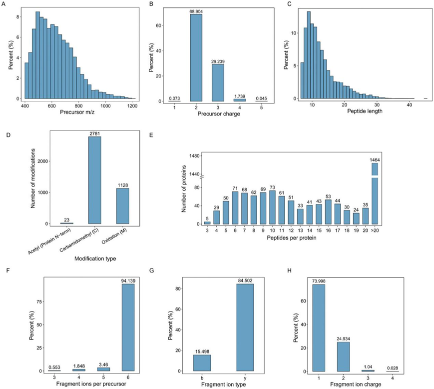 (a) 前体 m/z 分布。(b) 不同前体电荷状态的计数。(c) 肽长度的分布。(d) 修饰肽的数量以及不同修饰的分布。(e) 每种蛋白质的蛋白肽数量。(f) 每个母离子的碎片离子比例。(g) b、y离子的百分比。(h) 碎片离子不同电荷的比例。